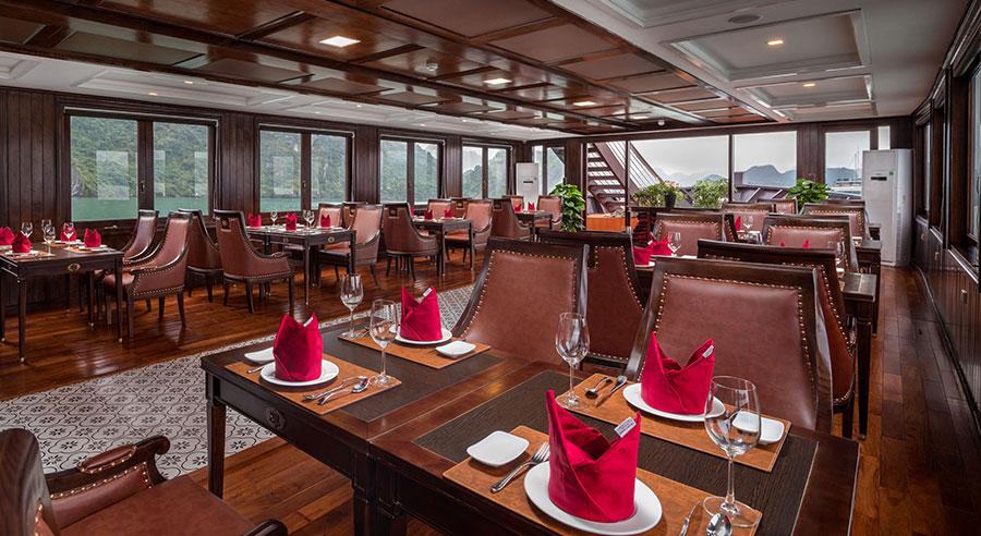 11.30 Set Lunch Menu is served on board while La Regina Luxury Day Cruise goes through the untouched area in Lan Ha Bay